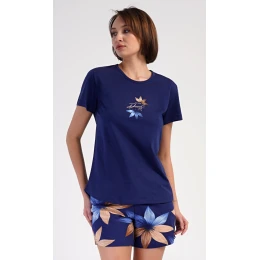 Dámske bavlnené pyžamové šortky Sara. Pyžamo sa skladá z trička s krátkym rukávom a šortiek. Jednofarebné tričko zdobí obrázok kvetu. Kvetinový motív sa opakuje na šortkách, ktoré majú elastický pás a šnúrku na stiahnutie a sú bez vreciek. Použitý bavlnený materiál je príjemný a pružný na dotyk.