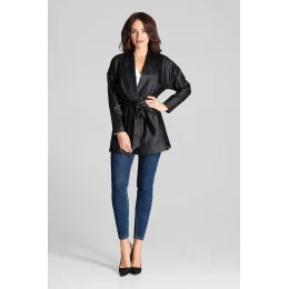 Čierna voľná bunda z ekokože so spadnutými ramenami. Zaväzovanie v páse s podšívkou a vreckami v bočných švoch.