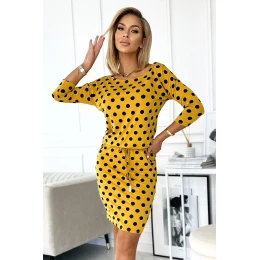 Dámske šaty 13-152 NUMOCO - čierno-žltá farba - okrúhly výstrih - trojštvrťové rukávy - voľný strih - širšia gumička a šnúrka so striebornými korálkami v páse - dĺžka nad kolená (v závislosti od výšky postavy) Zloženie materiálu: 95% viskóza + 5% elastan