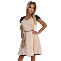 Dámske šaty 254-3 SILVIA NUMOCO - béžová farba - krátke čipkované rukávy - výstrih do V - dĺžka šiat siaha nad kolená - sukňa má rozšírený strih - opasok Zloženie materiálu: 95% polyester + 5% elastan