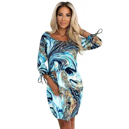 Dámske šaty 281-7 SOPHIE NUMOCO - modrá farba - okrúhly výstrih - módny novinový vzor - trojštvrťové rukávy zdobené viazaním - s vreckami - z hrejivého materiálu - bez pásku