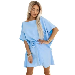 Dámske šaty 287-36 SOFIA NUMOCO - svetlomodré - voľný strih "butterfly" - trojštvrťové rukávy - zaväzovanie v páse - dĺžka po kolená
