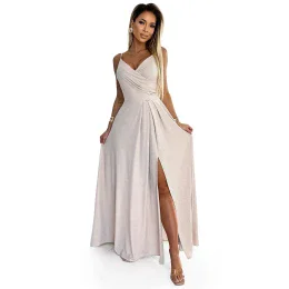 Dámske šaty 299-15 CHIARA NUMOCO - béžové - s tenkými ramienkami - profilovaný výstrih - maxi sukňa s rozparkom