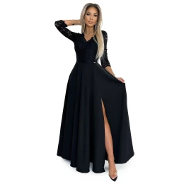 Dámske šaty 309-11 AMBER NUMOCO - čierne - elegantný strih - trojštvrťové rukávy - čipkované šaty s výstrihom - s rozparkom Zloženie materiálu: 95% polyester + 5% elastan