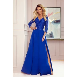 Dámske šaty 309-2 Amber NUMOCO - kráľovská modrá farba - elegantný strih - trojštvrťové rukávy - krajkové šaty s výstrihom - s rázporkom