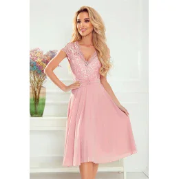 Dámske šaty 381-1 LINDA NUMOCO - staroružové - šifónové šaty - čipkovaný výstrih - krátke rukávy - naberaná sukňa