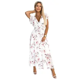 Dámske šaty 434-4 LISA Numoco basic - biele - kvetinový vzor - šifónové midi šaty - hlboký výstrih - volániky na ramenách