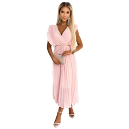 Dámske šaty 470-1 GIORGIA Numoco basic - broskyňová farba - riasené šifónové šaty - listový výstrih - bez rukávov s riasením - zlatá retiazka v páse