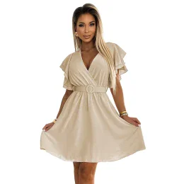 Dámske šaty 586-1 Numoco basic - béžová farba - vyrobené z mačkaného materiálu - voľné krátke rukávy - zavinovací výstrih - ležérna sukňa - široký opasok zvýrazňuje pás