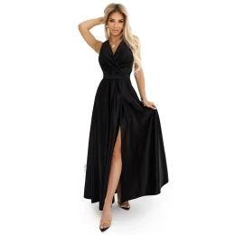 Dámske šaty 587-2 MONIQUE NUMOCO - čierne - vyrobené z lesklého brokátového materiálu - výstrih v tvare ceruzky - široké ramienka - vysoký rozparok - opasok v páse tvaruje postavu