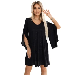 Dámske šaty 597-1 LIVIA NUMOCO - čierne - vyrobené z elastickej tkaniny s leskom - dlhé motýlie rukávy - výstrih do V jemne zvýrazňuje krk a opticky predlžuje hornú časť tela - trapézové šaty s voľným áčkovým strihom