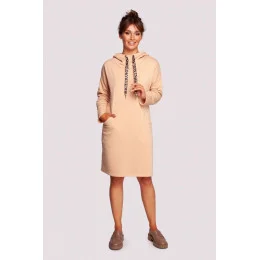 Pohodlné šaty na každodenné nosenie s vysokým golierom, ozdobnými stuhami s leopardím vzorom, kapucňou a vreckami skrytými vo švíkoch na prednom diele. Pletenina prispôsobená telu zaistí pocit tepla a pohodlia.