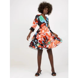 Čierno-oranžové mini šaty s volánmi a potlačou.