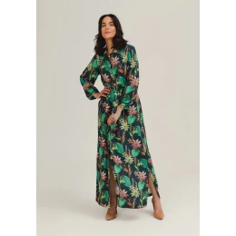 Dlouhé dámské šaty se španělským výstřihem a vzorem zelených listů a zlatých řetízků 194-4 - Numoco