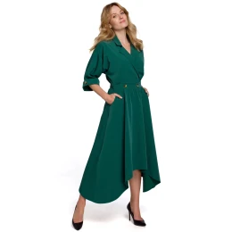Tieto krásne klasické šaty majú uvoľnený horný diel s golierom a širšími vyhrnutými rukávmi. Rozmerná sukňa má asymetrický lem a ozdobné gombíky v páse. Sú to elegantné šaty do mesta, ktoré sa hodia do práce aj na večernú prechádzku.
