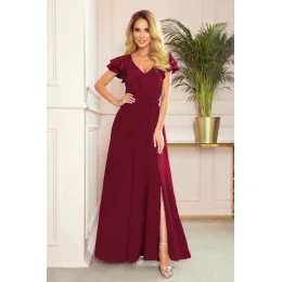 Dámske šaty 310-5 Numoco - dlhé šaty - výstrih do V - široké ramienka s volánmi - šnúrka v páse