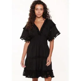 Dámske šaty od LingaDore. Šaty sú vyrobené zo 100 % bavlny, takže sú vhodné na horúce letné dni. Majú dĺžku po kolená a krátke rukávy. Vzadu a vpredu je hlboký výstrih do V. Pod prsiami je všitá elastická časť, ktorá krásne tvaruje postavu. Vrchná časť šiat je navrhnutá v madeirovom štýle s tromi čipkovanými pásmi posiatými malými strapcami. V spodnej časti je medzi látku všitý háčkovaný pruh a lem je z vrúbkovanej čipky.