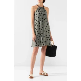 Dámske luxusné šaty s hodvábom. Potlač s bodkami. Šaty sú rafinovane obopnuté okolo krku a za krkom majú zapínanie na retiazku.