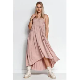 Krásne letné šaty zo vzdušnej viskózy rozžiaria váš deň. Je ľahká a vzdušná, vďaka čomu vyzerá pri nosení krásne. Zvlášť v spoločnosti letného vetra. Predná časť je o niečo kratšia ako zadná. V hornej prednej časti sú šaty zdobené jemným riasením, ktoré zvýrazňuje poprsie. Okrem toho má dvojité tenké ramenné popruhy. Šaty zakryjú nedokonalosti v oblasti brucha, stehien a zadku a budete sa v nich cítiť veľmi pohodlne. Či už v ňom strávite pár hodín, alebo celý deň. Skvele sa hodí k letným sandálom, dlhému voľnému svetru a prázdninovej nálade. Skombinujte ich s elegantnými ihlovými podpätkami a obľúbenými perlami a počas romantickej večere zažiarite.
