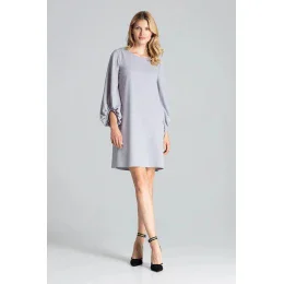 Šedé trapézové midi šaty s dlhými bufetovými rukávmi zakončenými riasením, bez podšívky, bez vreciek. Polguľatý výstrih.