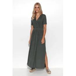 Dlhé šaty s hlbokým výstrihom. Krátky rukáv, masívna guma všitá v páse.