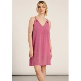 Dámske plážové šaty značky Muydemi. Šaty sú vyrobené z ľanu a viskózy, ideálne na horúce letné dni. Šaty sú voľné, jednoduchého strihu s dĺžkou nad kolená. Výstrih je v tvare V.