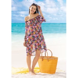 Dámske plážové šaty značky Siélei. Šaty sú voľné, ideálne na plavky, ak sa chystáte k bazénu alebo na pláž. Šaty sú dlhšie, mierne rozšírené do písmena "A". Okolo krku sú voľné, v jemnom elastickom páse, takže šaty môžete nosiť s odhalenými ramenami. Rukávy sú 3/4 a majú našitý volánik.