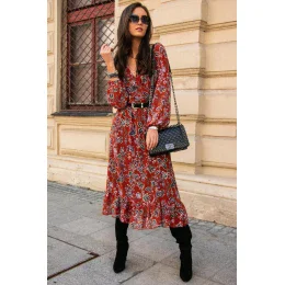 Šaty v dĺžke midi s módnym vzorom, zavinovacím výstrihom, nariasenou spodnou časťou, pružným pásom a podšívkovanou sukňou. Vyrobené v Poľsku. Modelka je vysoká 174 cm a nosí veľkosť 34.