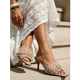 Žabky na úzkom podpätku spájajú ženský charakter s pohodlím pri obúvaní. Ozdobné strapce dodávajú štýlu ľahkosť a podčiarkujú letnú atmosféru. Zvršok je vyrobený z eko-semišu. Otvorený nos odhaľuje chodidlo a dobre sa osvedčí počas teplých dní.