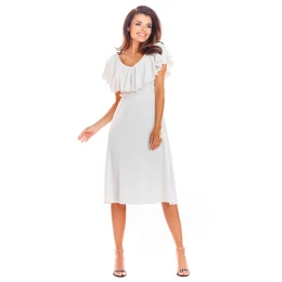 Mimoriadne elegantné a ženské midi šaty. Výstrih je zdobený volánikom, ktorý decentne zakrýva ramená. V páse má všitú gumu, vďaka ktorej sa prispôsobí postave. Šaty sú vyrobené zo splývavej látky, vďaka ktorej krásne sadnú. Zapínanie na chrbte na krytý zips. Letné ihličkové podpätky sa k nemu skvele hodia. Výrobok vyrobený v Poľsku.