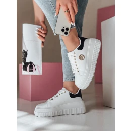 Dámske tenisky na pevnej podrážke sú štýlovou voľbou pre milovníčky mestskej elegancie. Ozdobná aplikácia na boku a kontrastná zadná časť upútajú pozornosť a dodávajú topánkam osobitý charakter. Model je vyrobený z ekokože s mäkkou textilnou stielkou. Sú ideálne na teplé jarné a letné dni.