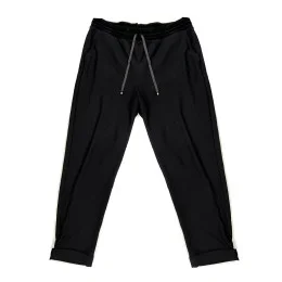 Dámske teplákové nohavice na trikrát prešitú gumu a zaväzovanie v páse. Pri gume je látka v štýle semišu. Spodná časť nohavíc je prešitá.