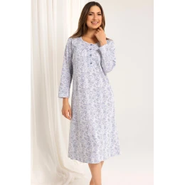 Dámska nočná košeľa 017 J/25 značky Regina je klasický model vytvorený s ohľadom na pohodlie a ženský štýl. Je vyrobená z kvalitnej 100 % bavlny s jemným vzorovaním a poskytuje priedušnosť a mäkkosť v každej fáze používania. Košeľa má dĺžku po kolená, dlhé rukávy a jemne nariasený výstrih na gombíky - ideálny aj pre dojčiace matky. Vďaka klasickému tvaru je košeľa vhodná nielen ako nočná bielizeň, ale aj ako pohodlné domáce oblečenie. Je dokonalou kombináciou elegancie, funkčnosti a pohodlia.