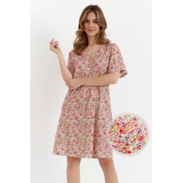 Ľahká a pohodlná dámska nočná košeľa vyrobená z vysokokvalitného bavlneného single jersey-u. Jemný, farebný vzor drobných kvetov vytlačený digitálnou tlačou jej dodáva jemný, ženský nádych. Košeľa má pohodlný, rozšírený strih, ktorý poskytuje voľnosť pohybu, zatiaľ čo predĺžené rukávy a okrúhly výstrih jej dodávajú klasickú eleganciu. Siaha až po kolená, čo zaručuje pohodlný spánok a plné pohodlie počas celej noci.