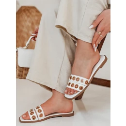 Módne dámske šľapky s nadčasovým dizajnom, vyrobené výhradne z ekokože. Remienky zdobené kovovými detailmi im dodávajú jedinečný charakter. Mäkká stielka a pohodlná plochá podrážka zabezpečujú pohodlie počas celého dňa. Počas teplých letných dní sa výborne hodia k voľným šatám a džínsom.