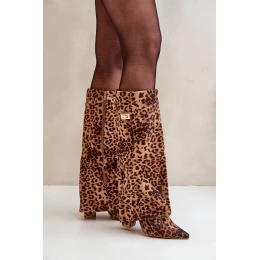 Damskie Kozaki Na Słupku Przed Kolano Panterka Brązowe Portora