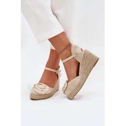 Damskie Sandały Na Koturnie Z Plecionką I Szydełkowym Kwiatem Beżowe Ismilea