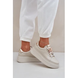 Damskie Skórzane Sneakersy Na Platformie Z Ozdobami CheBello 4292 Jasnobeżowe