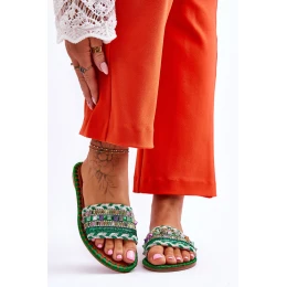 Wyjątkowe, damskie klapki ze zdobieniami na przodzie. Wykonane z wierzchu z połączenia materiału oraz tworzywa sztucznego. Zdobienia w postaci dżetów, ćwieków, brokatu oraz plecionej tkaniny wyróżniają to obuwie na tle innych klapek. Wkładka wykonana z eko skóry także została ozdobiona nicią. Klapki osadzono na płaskim obcasie z antypoślizgową podeszwą. Przy wyborze rozmiaru prosimy sugerować się tabelą rozmiarów.