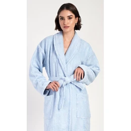 Dámsky dlhý froté župan so šálovým golierom Karolína. Dámsky dlhý froté župan so šálovým golierom, sťahovacou šnúrkou a vreckami je vhodný po kúpeli alebo na domáce leňošenie na gauči. Bavlnený materiál je príjemný a pružný na dotyk.