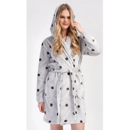 Dámsky krátky mäkký župan s kapucňou Puntík. Župan má kapucňu, vrecká a pásik na zaväzovanie. Svetlosivý základ zdobia tmavosivé guľôčky. Použitý mäkký materiál je jemný a poddajný na dotyk. Župan vás zahreje na ceste z kúpeľne a pri leňošení na pohovke bude vaším príjemným spoločníkom v chladných dňoch.