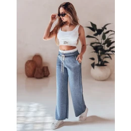 Tento dámsky dvojdielny komplet spája pohodlie s moderným dizajnom. Rebrovaný top bez ramienok má pútavú aplikáciu s nápisom, ktorá dodáva štýlu jedinečný nádych. Nohavice s vysokým pásom a širokými nohavicami ponúkajú pohodlné nosenie vďaka elastickému pásu a šnúrke v páse. Efekt vrstveného pásu s aplikáciou je tiež pútavým detailom. Model je ideálny na teplejšie dni - ideálna voľba na jar a leto.
