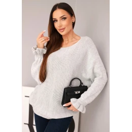 Dámsky mohérový sveter s nariasenými rukávmi a výrezom na chrbte svetlo sivý