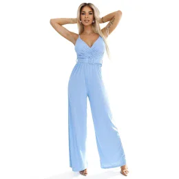 Dámsky overal 593-2 Numoco basic - svetlomodrý - z mäkkého elastického materiálu - výstrih v tvare ceruzky zmyselne zvýrazňuje dekolt - s tenkými ramienkami - široké nohavice - látkový pás so sponou - na každodenné nosenie, ako aj na formálnejšie príležitosti a večierky