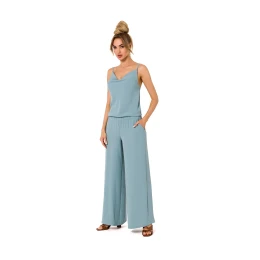 Nohavicový kostým so skladaným výstrihom a tenkými ramienkami zaväzujúcimi sa na chrbte. Kombinéza s elastickým pásom a vreckami na bokoch.