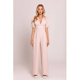 Elegantný overal so ženským strihom, vyrobený z vysokokvalitnej tkaniny. Hlboký výstrih do V krásne zvýrazňuje krk a dekolt, zatiaľ čo zvýraznený pás podčiarkuje postavu. Krátke nadýchané rukávy s manžetami dodávajú romantický nádych, zatiaľ čo mierne rozšírené nohavice so záhybom od pása dodávajú elegantný a voľný vzhľad. Model sa zapína na skrytý zips na chrbte s podšívkou pre väčšie pohodlie pri nosení. Celý kúsok je navrhnutý a ušitý v Poľsku s dôrazom na každý detail.