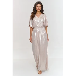 Tento overal je spojením elegance a pohodlí, které jistě přitáhne pozornost na každé speciální události. Volný vrchní díl s rukávy v kimono stylu mu dodávají lehkost a volnost. Tento detail dělá outfit vypadat mimořádně a stylově, zároveň neomezuje pohyb. Výstřih do V je decentní a elegantní, skvěle zdůrazňuje krk a ramena. Takový střih výstřihu přidává smyslnost a zdůrazňuje ženskou siluetu, zachovává klasický, elegantní vzhled. Nohavice s širokým střihem dodávají overalu lehkost a zároveň zakrývají nedokonalosti postavy a umožní prodloužit siluetu. Elastický pas v pasu zajistí přizpůsobení a zdůraznění postavy, vytvoří efekt přesýpacího pásu. Díky tomu se overal nejen stylově prezentuje, ale je i pohodlný po celý den nebo večer. Model je vyroben z jemného materiálu s metalickým povrchem, dodávající outfitu výjimečný lesk a moderní charakter. Overal v metalickém odstínu s výstřihem do V je návrh, který tě vystaví z