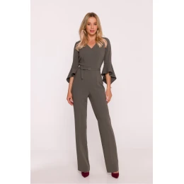 Dámsky overal z hladkej tkaniny s jemným povrchom, ktorý spája eleganciu s modernými detailmi. Výstrih v tvare písmena V jemne zjemňuje postavu a rukávy s dĺžkou 7/8 s volánom na konci dodávajú celku ľahkosť a výnimočný charakter. Vrchná časť šitá na mieru harmonicky ladí s rovnými nohavicami s ohrnutými lemami, čím vytvára súvislú, elegantnú líniu. Pás je zvýraznený opaskom so sponou, ktorý ešte viac zdôrazňuje ženskú siluetu. Model sa zapína na skrytý zips na chrbte, je bez vreciek a podšívky, vďaka čomu je ľahký a pohodlný na nosenie. Ideálna voľba na elegantné večierky, obchodné stretnutia a výnimočné príležitosti. Navrhnutý a ušitý v Poľsku.