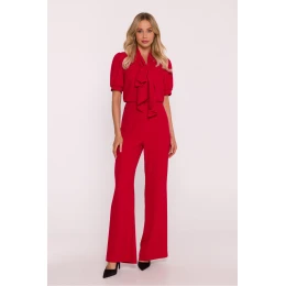 Elegantní dámský kombinéza je stylovou alternativou k šatům, ideální volbou na speciální události a elegantní výstupy. Vyrobený z hladké látky s lehkým leskem, působí velmi elegantně, zároveň zaručuje pohodlí při nošení. Model se vyznačuje ženským výstřihem ve tvaru písmene V, propojeným se stojkou přecházející do efektního vázání, které celku dodává jemnou finesu. Krátké, nadýchané rukávy jsou zakončeny manžetou s decentními záhyby, díky čemuž silueta získá lehkost a romantický charakter. Horní část má lehce zbluzovaný střih, a pas s vysokým pasem krásně zdůrazňuje postavu a opticky prodlužuje nohy. Nohavice jsou dlouhé, široké a lehce rozšířené ke dnu, což dává siluetě elegantní proporce a zajišťuje volnost pohybu. Celý outfit doplňuje skrytý zip vzadu, zaručující ideální přizpůsobení. Navrženo a ušito v Polsku s důrazem na detaily a nejvyšší kvalitu zpracování.