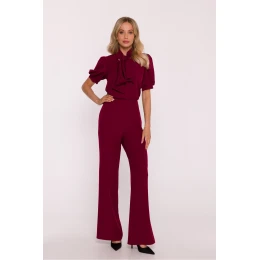 Elegantní dámský kombinéza je stylovou alternativou k šatům, ideální volbou na speciální události a elegantní výstupy. Vyrobený z hladké látky s lehkým leskem, působí velmi elegantně a zároveň zaručuje pohodlí nošení. Model se vyznačuje ženským výstřihem ve tvaru písmene V, spojeným se stojkou přecházející v efektní vázání, které celku dodává jemnou jemnost. Krátké nafouklé rukávy jsou zakončeny manžetou s jemnými záhyby, díky čemuž silueta získává lehkost a romantický charakter. Horní část má mírně rozvolněný střih, a vysoký pas krásně zdůrazňuje postavu a opticky prodlužuje nohy. Nohavice jsou dlouhé, široké a mírně rozšiřující se ke dnu dodávají siluetě elegantní proporce a zajišťují volnost pohybů. Celkový vzhled doplňuje skrytý zip vzadu, který zaručuje ideální přizpůsobení. Navrženo a ušito v Polsku s důrazem na detaily a nejvyšší kvalitu zpracování.